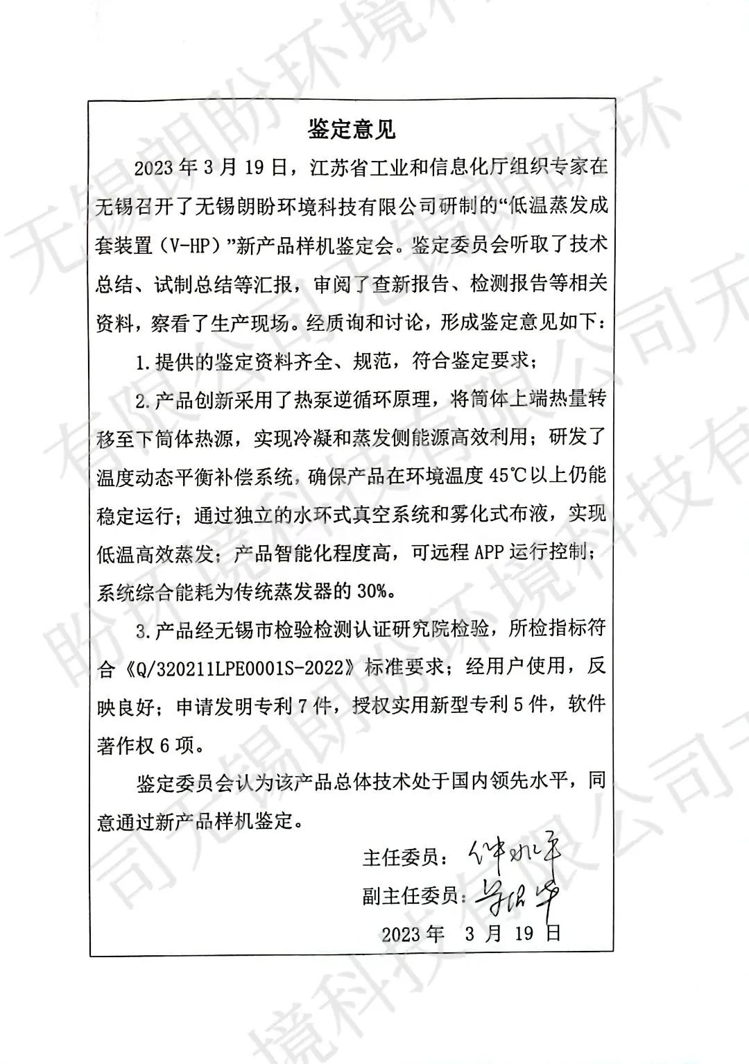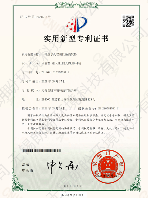 无锡朗盼环境科技有限公司是一家集研发、生产、销售为一体的高新技术公司。主要生产低温热泵真空蒸发器和结晶器等污水处理设备、以高浓高盐废水蒸发处理、液态危险废弃物浓缩减量和物料资 源化回收为主营业务,为客户提供工业污水零排放低温蒸发技术整 体解决方案。公司积极响应国家号召,秉承着“绿色环保,节能 减排”的企业愿景,全力推动企业向科技创新、品牌创新的方向发展 是国内第一家研发、制造低温热泵蒸发器、第一个申请发明专利的厂 家。并取得多项国家发明、实用专利及软著证书40余项及江苏省工业与信息化厅新技术新产品认定证书。