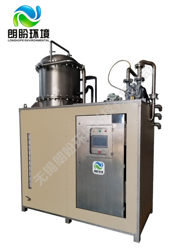 • 低温蒸发结晶器的原理是物料的沸点随着压强的降低而降低。低温节能浓缩设备整体保持真空状态,蒸发室的真空度约为95%~97%,在此压强下水的沸点为35℃~37℃,系统无需配备进料泵,利用蒸发室的负压将物料吸进蒸发室,通过强制循环方式将物料循环雾化,传输至换热器上,物料中水分被蒸发,物料连续循环雾化,通过蒸发室液位自动补料,浓度达到要求后作为浓缩液排出设备。浓缩液一般粘度较大,需采用泵抽出。